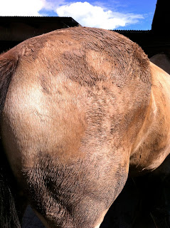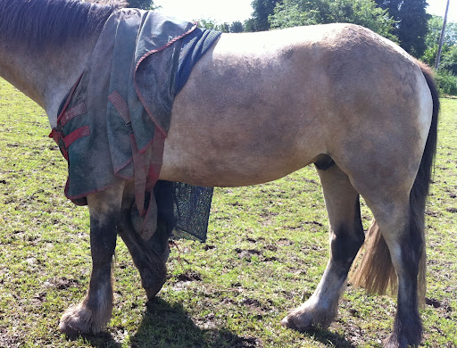 After three days of non-stop downpours, my paddock was an ocean of mud – just the sort of stuff Flurry loves to coat himself with. I put a light rug on him on Saturday in the hopes of keeping him clean for Sunday morning. My hopes were crushed, however, when we drove past our paddock and I saw that he was wearing his rug around his neck, leaving his body exposed to the joys of rolling.