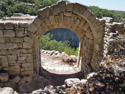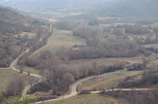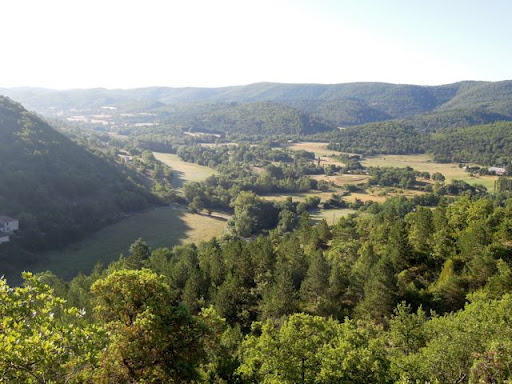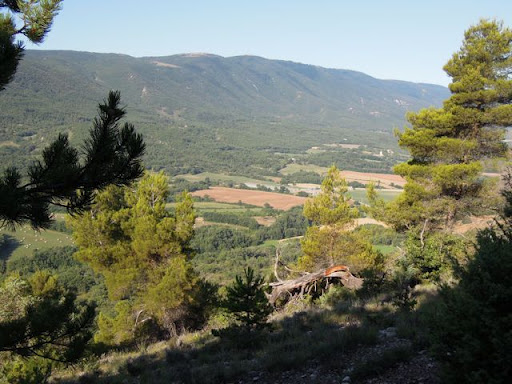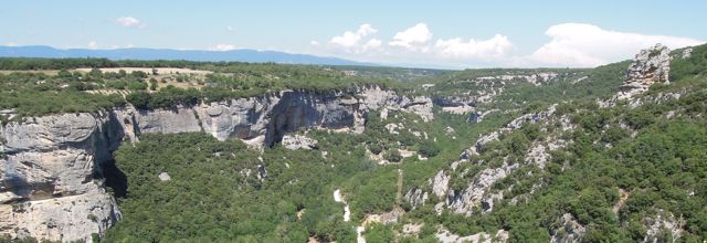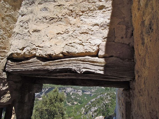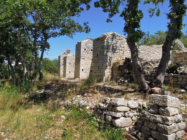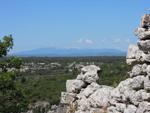 Today, we visited the ancient fort at Buoux – well worth a visit. It’s being excavated and somewhat restored at the moment, but you can still wander around and look at everything. It dates back to the 12th or 13th century, and was clearly a very important point of defence. It sits perched in a rocky hilltop in the middle of a gorge, surrounded by cliffs, mountains and forests. The view to the northeast has the most cliffs :