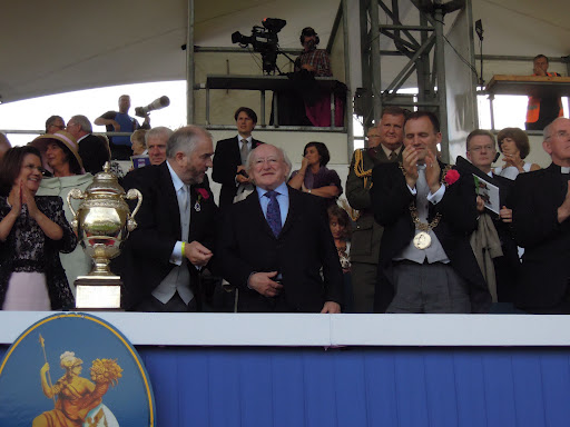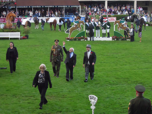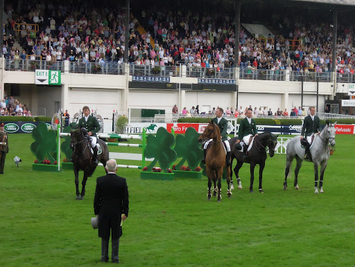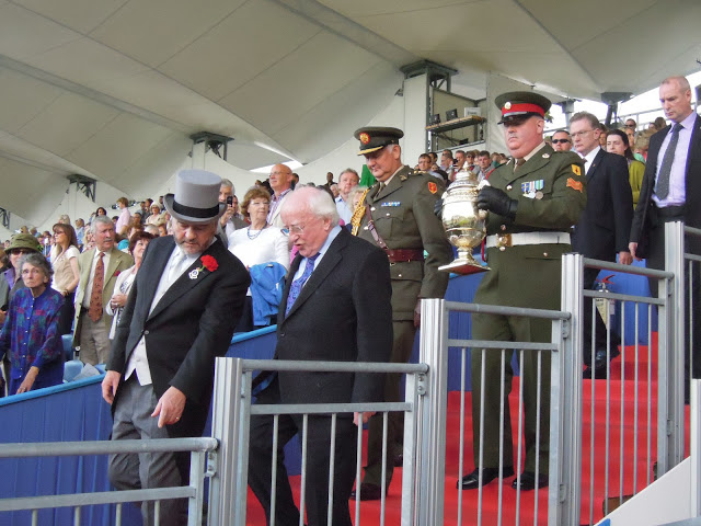Then we had all the pomp and circumstance of the prize-giving. As it happened, I was sitting just in front of the dignitaries box. The little leprechaun in the centre is Michael D. Higgins, who hails from my former home town, and happens to be President of Ireland! To the left of him is Fonsie Mealy, president of the Royal Dublin Society, which hosts the Horse Show, and to the left of him is the gleaming gold Agha Khan trophy – donated by the Agha Khan for this event. It’s about the same size as the Irish president, so I was hoping he wouldn’t have to lift it!