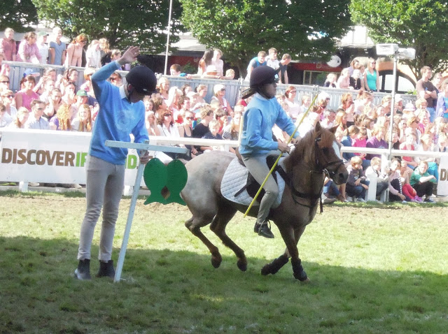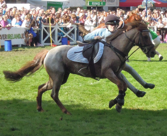 This little roan pony is the first pony I ever bred, Toffee. I didn’t expect to see her at Dublin, but there she was, nineteen years old, and still going strong, competing in the Pony Club Games at the show. She’s a games expert – we tried to make her into a jumping pony, but she wasn’t interested and ended up going to a friend for Pony Club. She’s won loads of games championships and has even represented Ireland abroad.