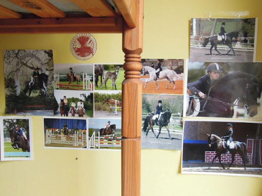 Her wall of photos, full of reminders of great days out, Pony Club, show-jumping, dressage and more.