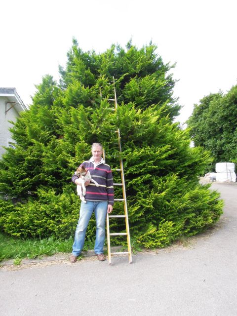 Somehow, he excused himself from the call and appeared on the scene. The ladder was leaned up against the tree and I held it while he climbed. Well, I held it until I took this photo, anyway.