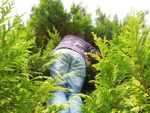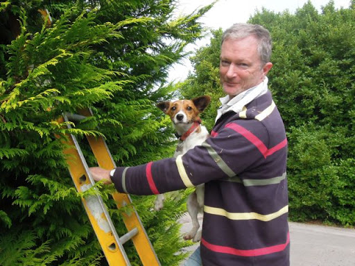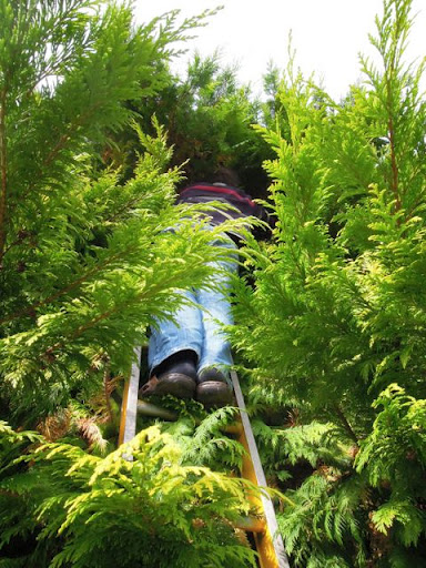 Somehow, he excused himself from the call and appeared on the scene. The ladder was leaned up against the tree and I held it while he climbed. Well, I held it until I took this photo, anyway.
