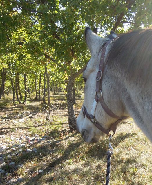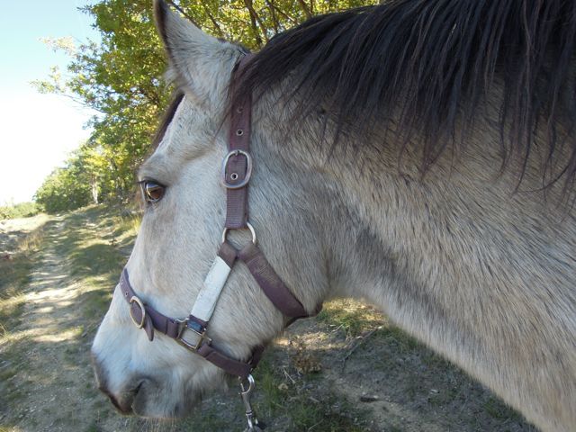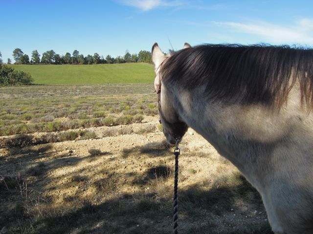 We walked out into the lavender field again and he relaxed visibly, staying close to me all the time and occasionally nudging my hand or my arm as we walked along. I honestly think he really needed some time with me. Although he’s not a very demonstrative horse, he is very attached to me – when my wrist was broken and other people were riding him for me, I would walk out on treks with them. Flurry never took his eyes off me, and if I took a short cut, across a corner of a field, for example, he would try to follow the route I had taken.