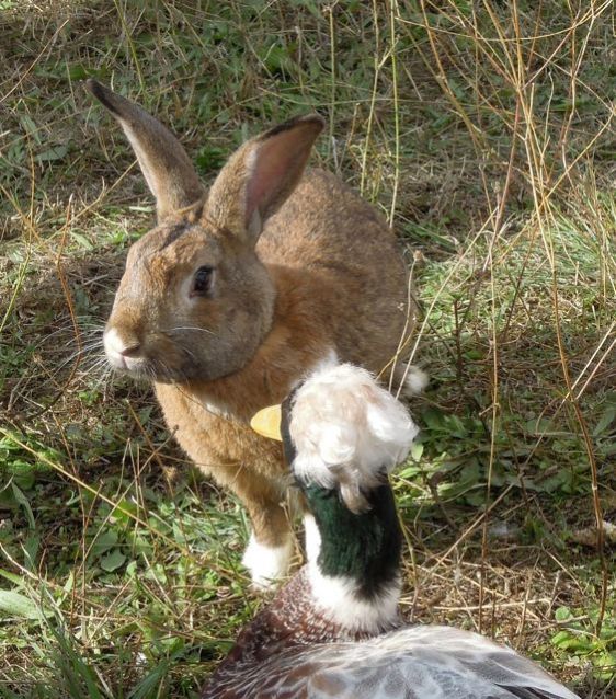 I think this very large (meaty? sorry Thumper!) rabbit was teasing the drake about his hair-do :