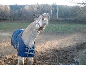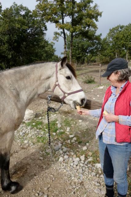 The local horse people collect stale baguettes to give to their horses as treats. Flurry remembers this well from last year and was delighted to see a demi-baguette heading his way. He kindly showed Aero what to do with it.