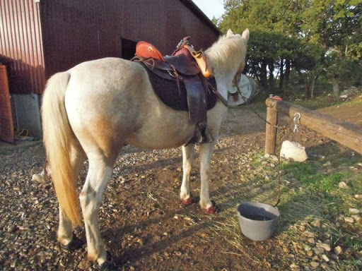 Alexandrine’s mother Marie-Christine then arrived, to accompany Alexandrine the first time she rode a young horse out. More chatting ensued, as she tacked up her horse, Pietro. She told me that Pietro is supposed to be a Criollo, but doesn’t have any papers. She’s only had him since last January, she bought him when her old horse had to be retired. On his feet, he wore Renegade boots – her old horse was barefoot for seventeen years and Pietro is making the transition to barefoot. She does her own trimming, but gets the farrier to check her horse every eight weeks or so. She rides in a rope halter – Alexandrine helped her train Pietro to be rideable in a halter instead of a bridle when he arrived last January. On his back, was a western type saddle, with a bridle slung over the horn – just in case she needed extra control if Alexandrine’s youngster was difficult. Also slung over the horn was a leather case, containing a large pair of snips and a foldable saw – she told me that, as she rides along the local trails, she cuts down any low branches and helps to keep the trail clear for everyone. I also noticed that she was wearing a helmet – I was a little surprised, actually, that’s quite un-French. I remarked on it and she said she always wears one, and I nodded, I always wear one too.