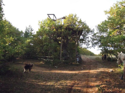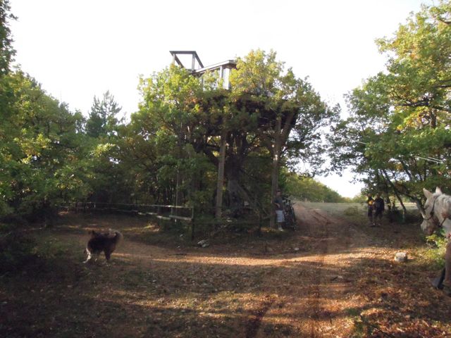 | Tree-house. You can see Pietro’s head on the right with his rope halter |