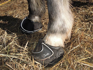 The day after I dumped it, I took Flurry for a hack. He’s been a little tender in his feet recently, so I put on his front boots. We were nearly back at the farm, climbing up a rocky ascent, when he stumbled. “That’s a boot gone” I thought, and I looked down. Sure enough, the front left was missing, but fortunately I spotted it on the ground, a short distance behind us. I hopped down to pick it up and glanced at the front right – what the heck? The boot seemed to have twisted around completely, so that the heel captivator was sitting on the front of his pastern.