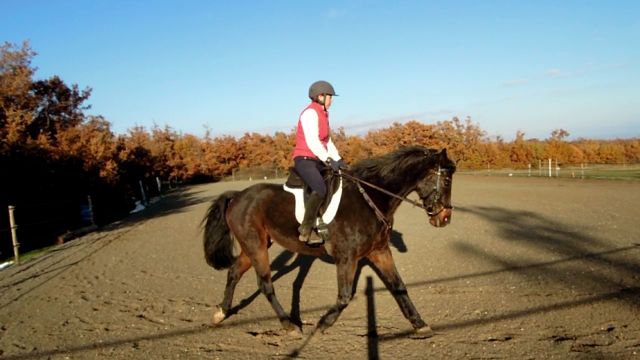 We proceeded to work… and it got better and better. I was trying to remember what I had learned with Frank in Skevanish back in June – ask him to go forward and keep offering little alternate gives on the reins, which encourages him to soften and work into the contact. Apart from losing my balance once or twice early on, I was able to stay with his bouncy trot and offer him a contact he could trust. We did walk/trot circles, serpentines, leg-yielding, shoulder-in (not sure I had the angle right, sigh…), then a couple of canters, with circles and transitions.