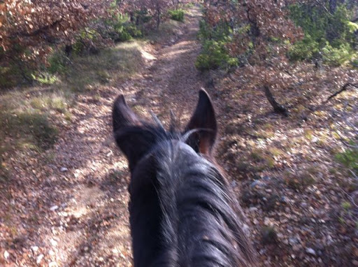 The path got fainter and fainter, until it became clear that we were following a sheep trail through the forest. Ok, MC had gone slightly off course, but we could see the proper trail beneath us. We were on a steep hillside, covered in stunted oak trees, far too low for us to duck under on horse-back, so dismounting and leading the horses back down to the trail was the obvious thing to do. MC went first, with a slightly heart stopping moment as Quieto half-slid, half-fell down the slope behind her. Aero and I descended by a different route – we had the advantage of MC being able to spot an easier way down for us! A slight scramble/slide/jump later, with Aero popping down neatly slightly behind/beside me, and we were back on the trail again… or were we?