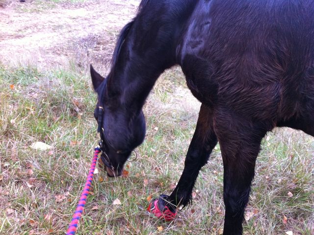 We had to have a brief stop because Quieto had pulled off both hind boots, leaving one behind where he had had his bad slip. MC held both horses, who stood like angels while I went back and fortunately found the boot very quickly.