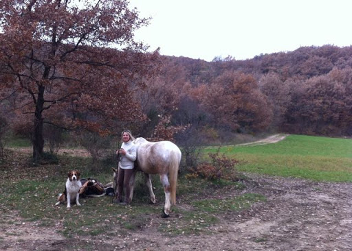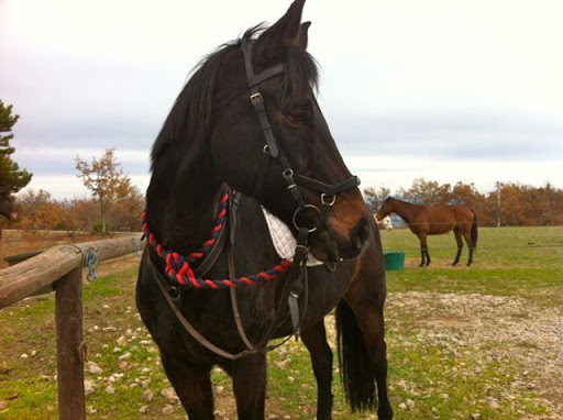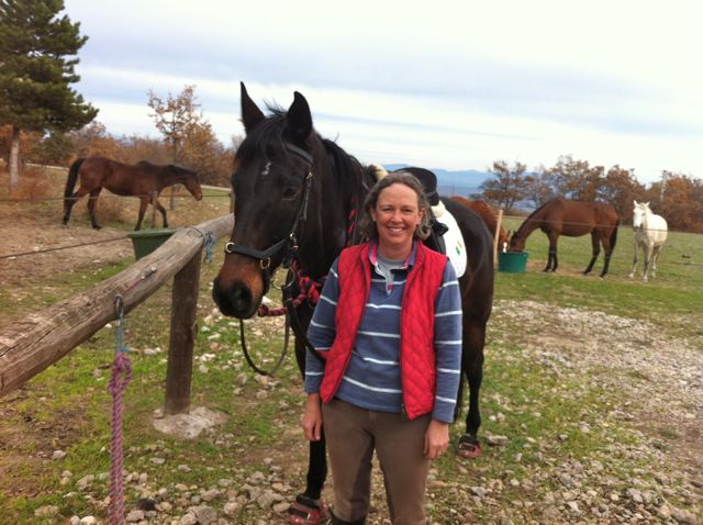 Eventually, huffing and puffing (the two mature ladies, not the horses!) we reached the trail and remounted. We had one final bit of excitement, though. As we went through the grounds of Le Couvent de Notre Dame (we shouldn’t have been there, shhh!) two sheep ran across in front of us. The temptation was too much for Doug, and he gave chase enthusiastically. Aero wasn’t bothered, either by the appearance of the sheep or the dog chasing them, but unfortunately Doug didn’t reappear, despite calls of “Au pied!” from MC. We had to turn back and tiptoe past the priest’s house once again, hoping that Doug wasn’t tucking into fresh, juicy sheep as we went.