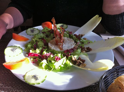 The starters arrived quickly, along with a small basket of bread. The Tartare de Chèvre was basically a wodge of goats cheese, nicely presented on a bed of salad, garnished with a couple of pieces of crispy pancetta.