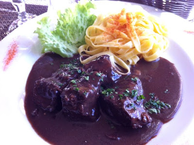 My Rôti de Porcelet (roast piglet!) came in a red wine sauce and was served with Tagliatelle. I seem to be destined to eat pasta at our lunches! In this case, there was less pasta on the plate than last week, which suited me fine but might not suit a big MAN appetite quite so well! This was really tasty, possibly a little on the salty side, but that’s a personal taste thing, I suppose.