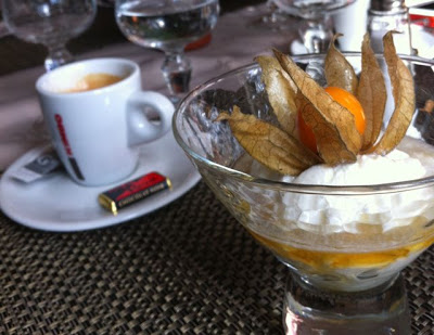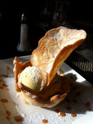 Finally, dessert. The LSH ordered Tuile à Lavande, served with ice-cream. The Tuile is the biscuity thing. It was beautifully presented, we both agreed it looked like a sail-boat with its spinnaker up, cruising along! It tasted as good as it looked, too, and the ice-cream was yummy too – a nice grown-up kind of flavour (but neither of us can remember what it actually was, oops).