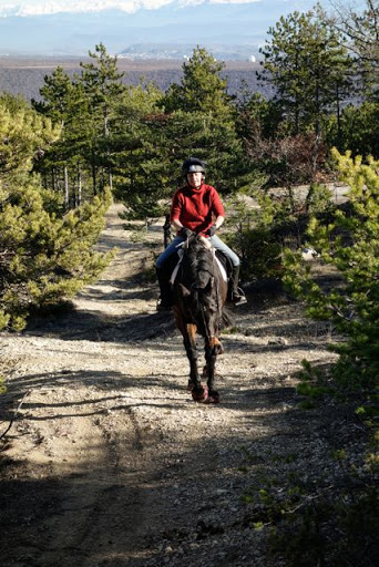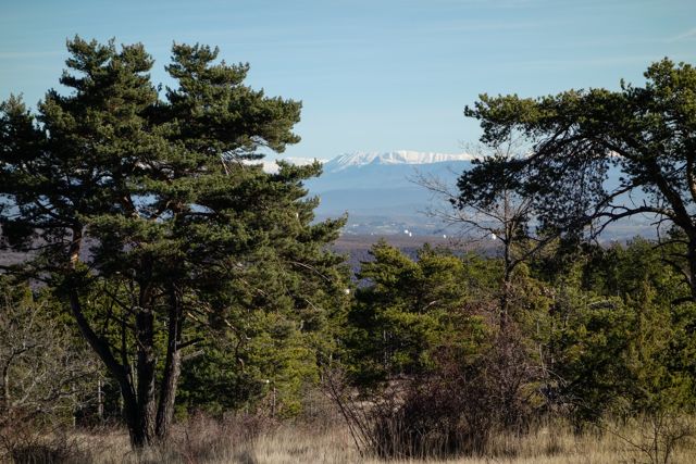 After riding, we came home, had a quick lunch (a glass of 7Up and a banana!!) and went out again to the Montagne de Lure. We’ve been threatening to go there for the last three months to try to catch a view of the Alps bathed in the evening sun. We were surprised to find that there’s a ski station near the top – it seems to be a very easy, family oriented slope, with lots of kids and learners around. We went for a short walk with the dogs. Cookie was crazy in the snow, rolling and wriggling in it to her heart’s content. We found it tougher walking in the snow than the dogs, and turned around after about fifteen minutes. Unfortunately, we never got the amazing view of the Alps that the LSH is looking for, the road was closed after the Ski Station and the view eastwards was blocked by the mountain’s peak. We’ll have to try again, using an approach road on the eastern side of the mountain.