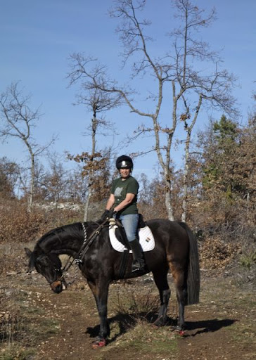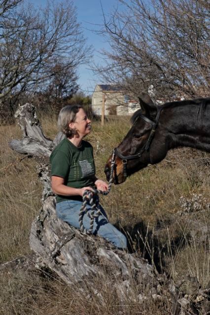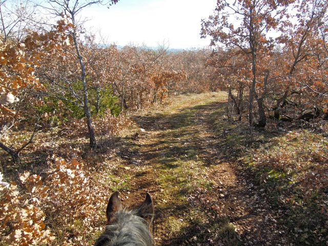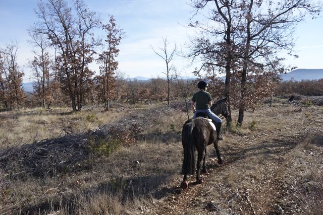 When we got to the top of the last ascent near the farm, we dismounted and let the horses graze. We also removed their bits – it’s easy to do with the Micklem bridle, and it’s something I want to get into the habit of doing when they are given permission to graze. I got lazy and sat on a log, and Aero was checking me out for carrots rather than grazing at first, but he got the idea eventually!