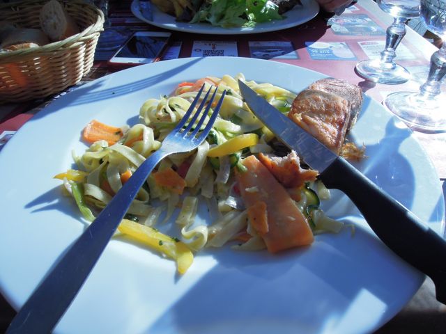 The faux-filet was presented with chips and some salad. Very plain, but very tasty. I wasn’t asked how I wanted my steak cooked – fortunately “rare” is what I would have said, but I know that wouldn’t be to everyone’s taste.
