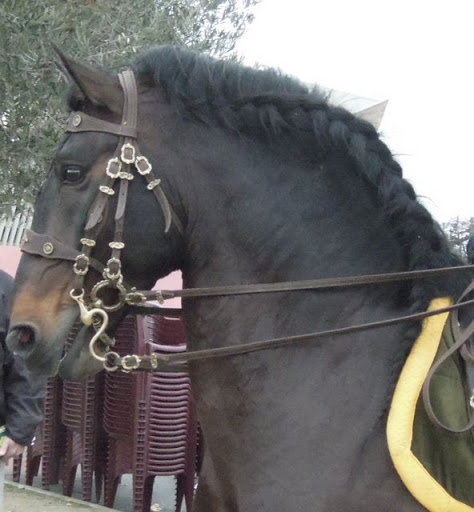 We left the cutting horse arena to go for lunch at the nearby Iberian horses hall. We were told that the ringside tables were reserved for large groups only – humph! As it happened, though, there wasn’t much going on – we saw the tail end of the class for working Iberian horses, where horse and rider negotiate a series of obstacles, showing how well-schooled the horse is as they pirouette around a pole, half-pass along a raised pole, (forelegs on one side of the pole and hind-legs on the other), walk forwards and backwards along on L made out of poles and also go over a jump. Horse agility/Handy Horse meets dressage, I think!