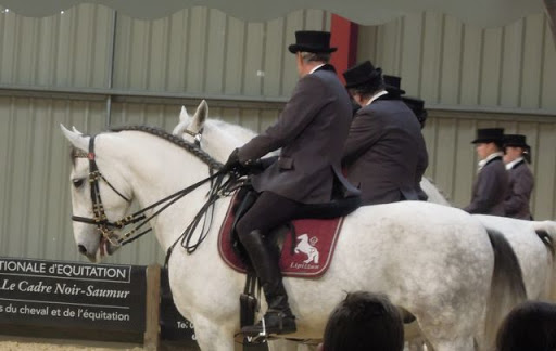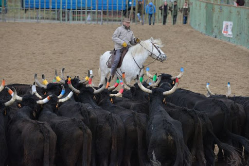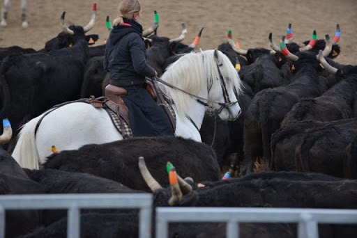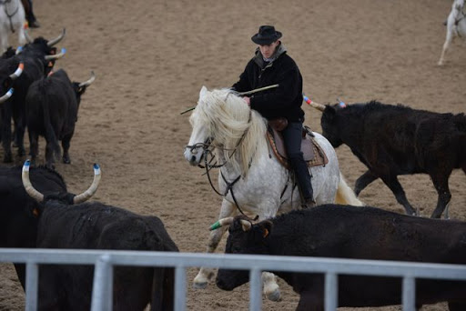 This concept of Cabaret Équestre is completely new to me, and it opened my eyes to a whole alternative horse-industry here on the Continent which we don’t get in Ireland or the UK. Yes, I admit that at the big shows (Dublin, Royal Balmoral, HOTY etc) we’ll have a Big Name horse performance, like the Mounties or the Cossacks or Lorenzo or Jean-François Pignon, but they are the elite in this industry. Beneath them, there are hundreds if not thousands of performing horses and their riders. Many of them have acts which are very circus-like, perhaps they also spend some time touring with a circus? Others have classical leanings, like the performing Iberian horses or the Lipizzaners pictured above, then there are the vaulters, the story-tellers, the ballet-performers… a whole slew of horse lovers making a career out of their passion in a way that is entirely new to me.After our lunch, we watched some Camargue horses doing their Tri de Bétail (cattle sorting) with the long-horned black Camargue bulls.