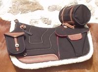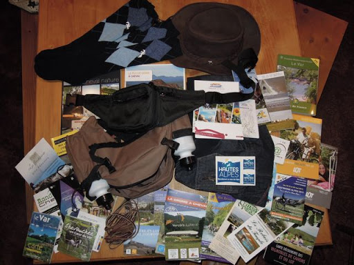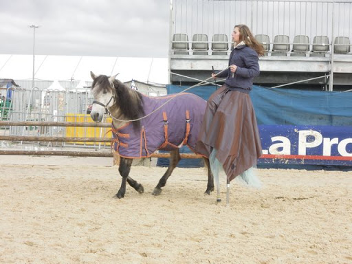 We left the dogs in the car while it rained and we went SHOPPING! Well, actually, we didn’t buy a whole lot but we visited every single trade stand in each of the five halls. One hall was devoted to equitourisme, and we got lots of leaflets, maps, brochures and even some advice from the people manning the stands. I got to meet the owner of the Gite Équestre which is closest to Flurry and Aero – it’s an easy day’s ride away, at St Simiane La Rotonde – and he showed me a nice four-day circuit we could do. I assured him I’ll be in touch! The LSH finally found a hat which A. fits him and B. doesn’t look too hideous on him. Of course I forgot to take a photo of him wearing his new hat (it’s an Aussie hat), but it turns out he was in the background of one of my horse shots, so that’s him in his new hat on the right of this column! Then while he was trying on denim jodhs (I refuse to let him wear normal jodhs anymore), I found a wonderful numnah which is designed for trekking with an English saddle. It has four pockets and a rolly-up plus lots of rings for attaching other saddle-bags. I went back to the changing room, told the LSH about it and in that time it was SOLD!!! AAAAAGH! But I’m going to order one on-line, this is what it looks like :