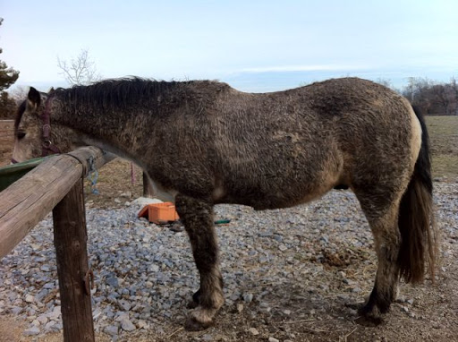 Use the metal curry comb to break up the concrete-like chunks of muck. If that doesn’t work, try using your fingers first to break the chunks up a bit before tackling them with the metal curry comb. If THAT doesn’t work, you have no choice but to use scissors to cut the stubborn chunks out (before you ask, yes I did – behind his ears). After the first pass, go back over each section a few more times to chip away at the stubborn bits, then, to finish it off, use a dandy brush to put a nice nap on the coat.