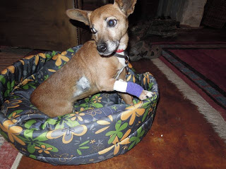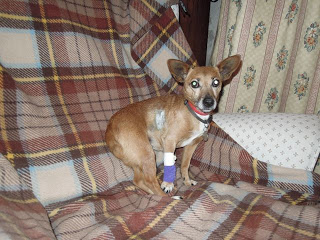 Unfortunately I found a second lump a couple of days ago, so that had to come off, too, hence the bandaged leg. It’s right on her knee, so she gives a little squeak every time she bends it.
