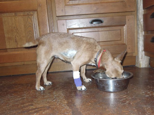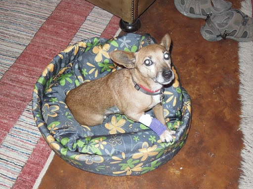Unfortunately I found a second lump a couple of days ago, so that had to come off, too, hence the bandaged leg. It’s right on her knee, so she gives a little squeak every time she bends it.