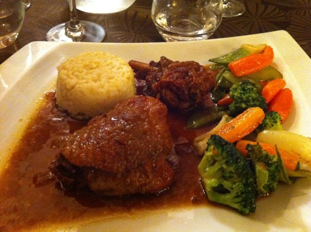 G and I opted for the same main course, Cuisse de Pintade, a leg of guinea fowl. Guinea fowl has been a revelation and I buy it quite a lot in the supermarket here. To me, it’s just like chicken used to be, in the good old days before they started pumping it full of liquid. The meat is more fibrous and less glaringly white than chicken, and although some people might find the flavour a little gamey, it just tastes extra-chickeny to me.
