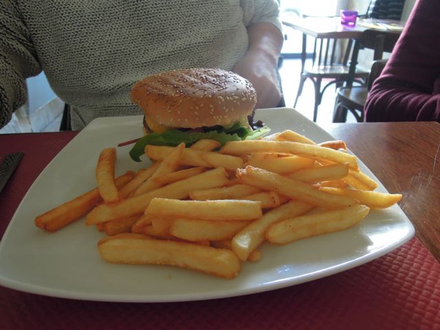 I reasoned that the best time to eat healthy diet food is while your waiting for the meat to cook, so I opted for the salad as did R+G. Martine, being the only one of us that was alert to what the menu had to offer, asked what the special was. “Tarte de Chèvre” came the chirpy reply. The salad orders were quickly cancelled and we all herded after the goat. It appears I was not the only one that craved meat as R+G went for the burger as well, whiled Martine opted for the Pâtes aux cepes, wild mushroom pasta.