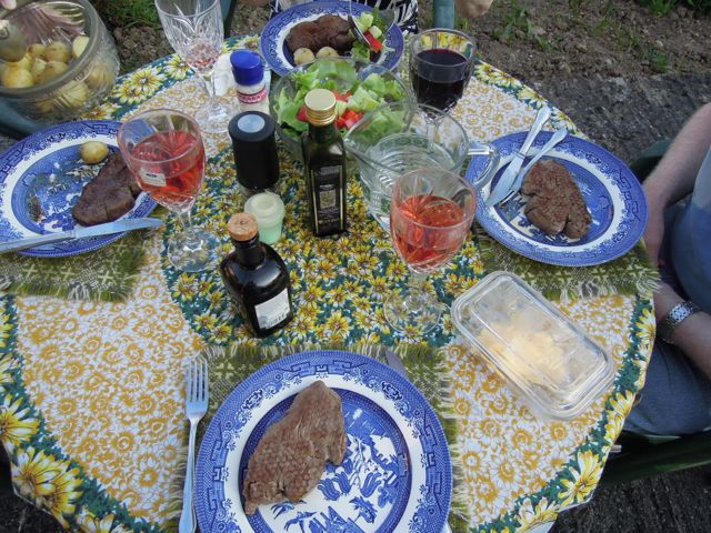 The sun beamed down all day from a clear blue sky and the lake was looking as beautiful as ever so we decided to dine Al Fresco. The table and chairs were retrieved from the garage, where they have been hibernating for the last two years, scrubbed down and laid out in front of the house.