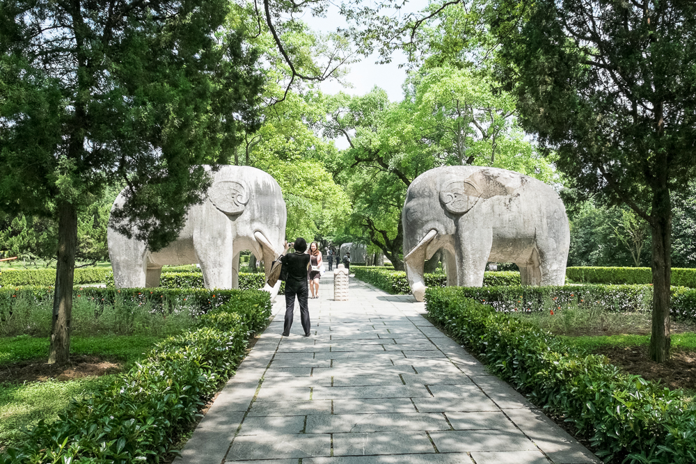 By now the sun was in full force, and the temp was somewhere in the 30s with high humidity. Nontheless we climbed up behind the Ming Xiaoling Mausoleum and back down to the sacred way. Roughly 2KM long, the road is lined with 12 pairs of animals all carved in stone.