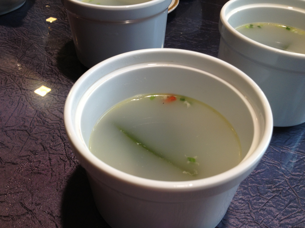 It turns out Huaiyang cooking is very very different. I am not sure where to begin to explain what I mean, so I will go with the order in which things struck me. Not surprisingly the first things I noticed were all visual: there is almost a colour coding going on with many dishes consisting of foods of a similar or identical colour. Unfortunately the colour is often very bland, particularly compared to Cantonese cuisine, and consequently the dishes have less eye appeal. There is almost a complete absence of sauce, instead a soup or clear broth either accompanies the main dish or is part of the main dish. The dishes also seem to be very simple in that they tend to have very few ingredients, I am told that this is to place an emphasis on the main element in the dish. In many of the dishes, the vegetables were overcooked to my taste, lacking any of the bite one associates with stir fried veggies.