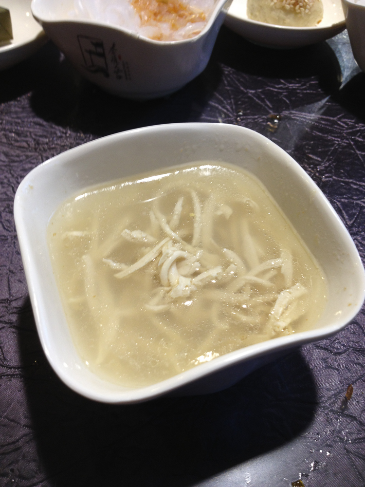Stinky tofu was followed by just plain old Tofu in broth. This and other dishes later in the meal are exemplars of the colour coding I referred to. The tofu itself had the consistency of a rubbery omelette, but it tasted slightly sweet and salty – very nice indeed.