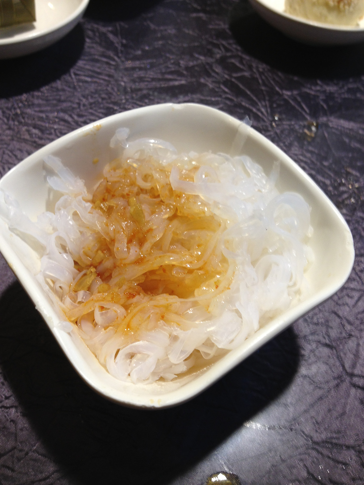 By now the table was full with 60 dishes, 20 for each of the three of us. So I could pick and choose in which order I ate the dishes. The Century Egg had been taunting me since it was put down on the table, not least because I had no idea how to attack an egg with chop sticks. Century Eggs are made by marinating eggs in quicklime, salt, ash and rice husks. Typically they are left in the mixture for 2-3 months. The yoke goes grey and gelatinous while the white goes a dark almost pearlescent brown. I suspect these eggs were done in the more modern process which takes less time but can produce a different visual result. The egg yolk tasted more like sulphur than normal eggs, while the white had very little flavour at all. The aroma was that of crispy duck as served in Ireland and the UK, with mild ammonia overtones (if ammonia can be mild). I guess I was disappointed in this dish as it held such promise. Nice but not awe inspiring.