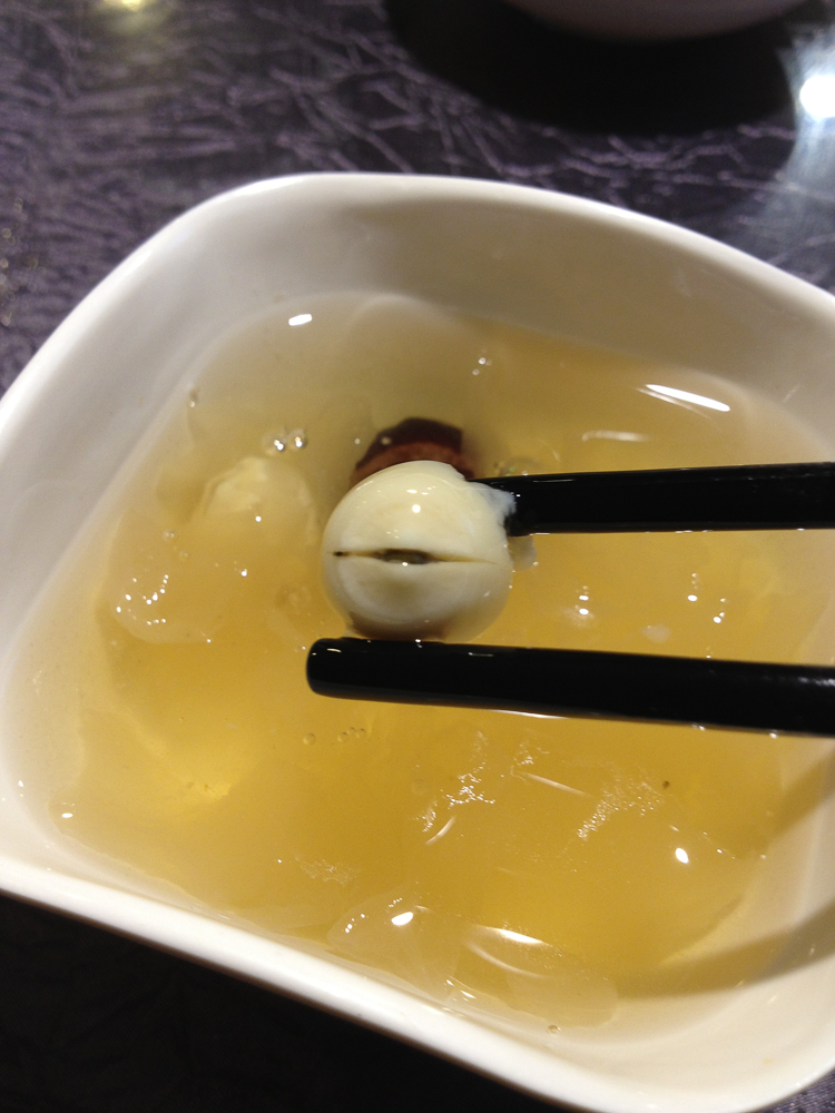 No the next dish was not a baby dolphin in soup but the seed of the lotus blossom, served with a prune according to ZXG. This had a very delicate flavour and by now I was beginning to realise that this was a bit like wine tasting in that you should start with the delicate stuff and then move to the full bodied reds. After the heavy spice and salt of the previous dish the delicacy of this dish was lost on me. Strangely, while we had some tea before the first dish we were not offered any drink with the meal, not even water. This was to be repeated in all restaurants that we went to during the three weeks. So there was no way to cleanse the palate between dishes. So all I could do was plough ahead.