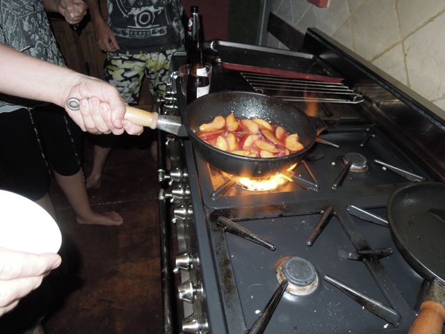 Decide that all the alcohol has boiled off. Prepare to throw another good measure of rum into the pan. Stand back as Dad (aka the LSH aka the Long Suffering Husband) takes over, keen to prevent any further misuse of his Bacardi. Watch as he lashes the rum into the pan and with a twist of his hand, angles the pan so it ignites from the gas ring.