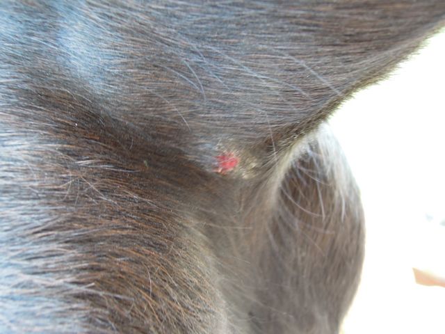 While I was in Ireland at the start of June, Alexandrine continued to dose Aero and to dab the lotion on, and while I was away, the one behind his jaw dropped off, leaving a little wound.