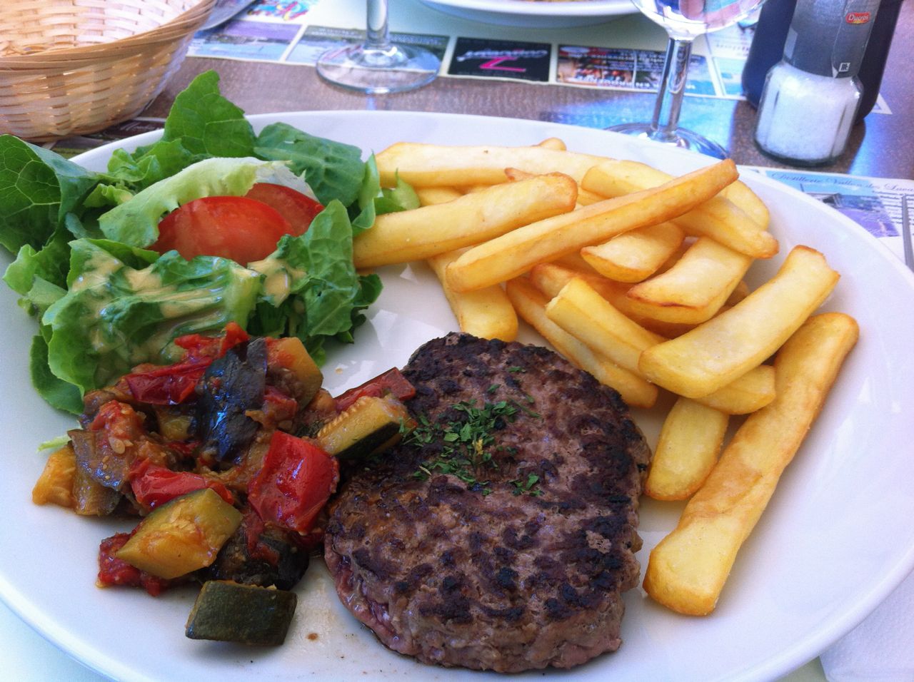 Anyhow, his burger was good. Cooked medium rare – gasp! Health & Safety has not yet hit France…