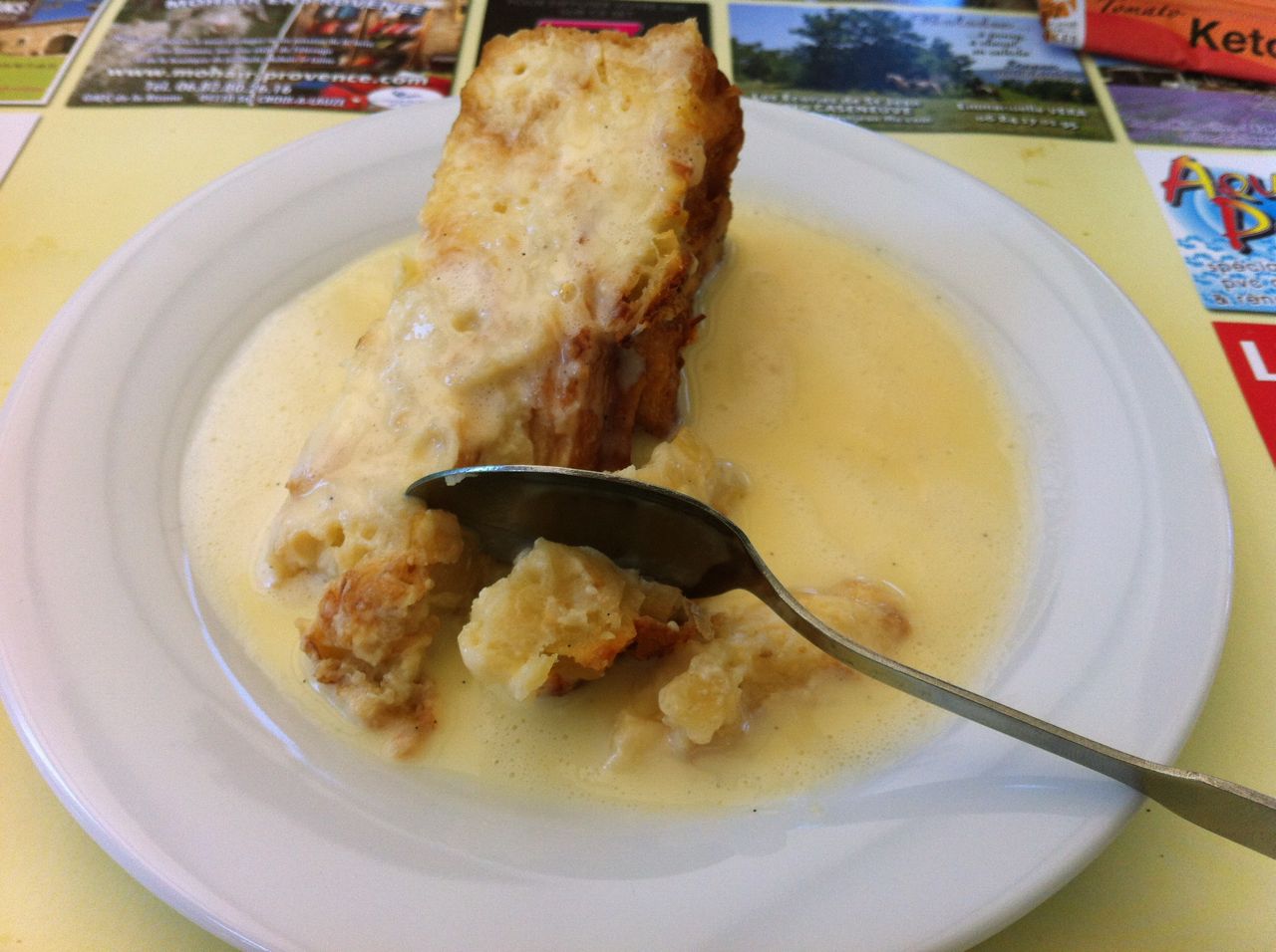Portion sizes were good – not huge, like last week in Le Gargantua. We all had room for dessert. Four of us went for Creme Caramel and the LSH went for Diplomat Creme Anglais, just because we were all wondering what it was. “I bet it’ll be a kind of bread pudding,” he said.