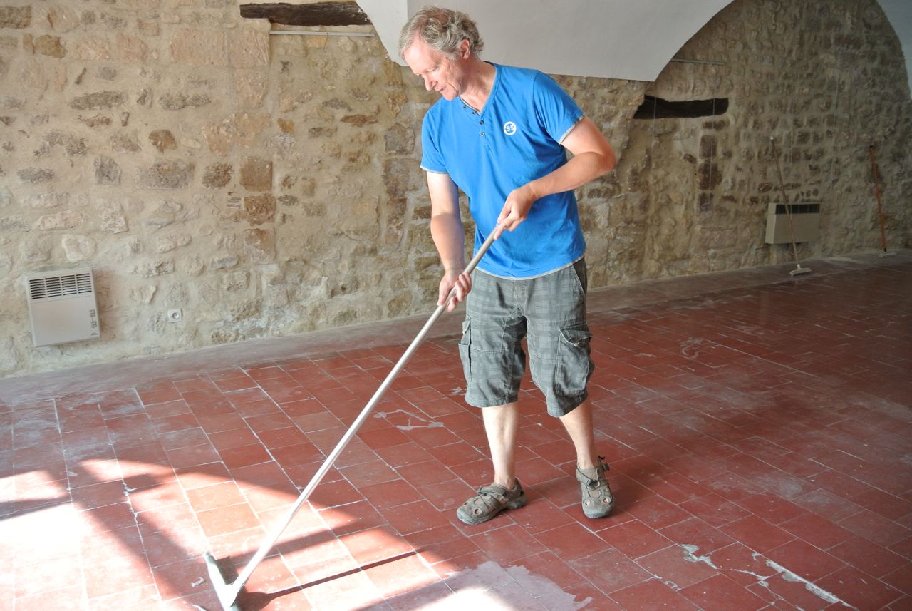 He took possession of the gallery space just after a craft group. And discovered a whole new set of things that needed doing. Clear out all the tables the craft group had been using. Brush the saltpetre off the walls. Sweep the saltpetre off the floor, along with a whole pile of other dirt.