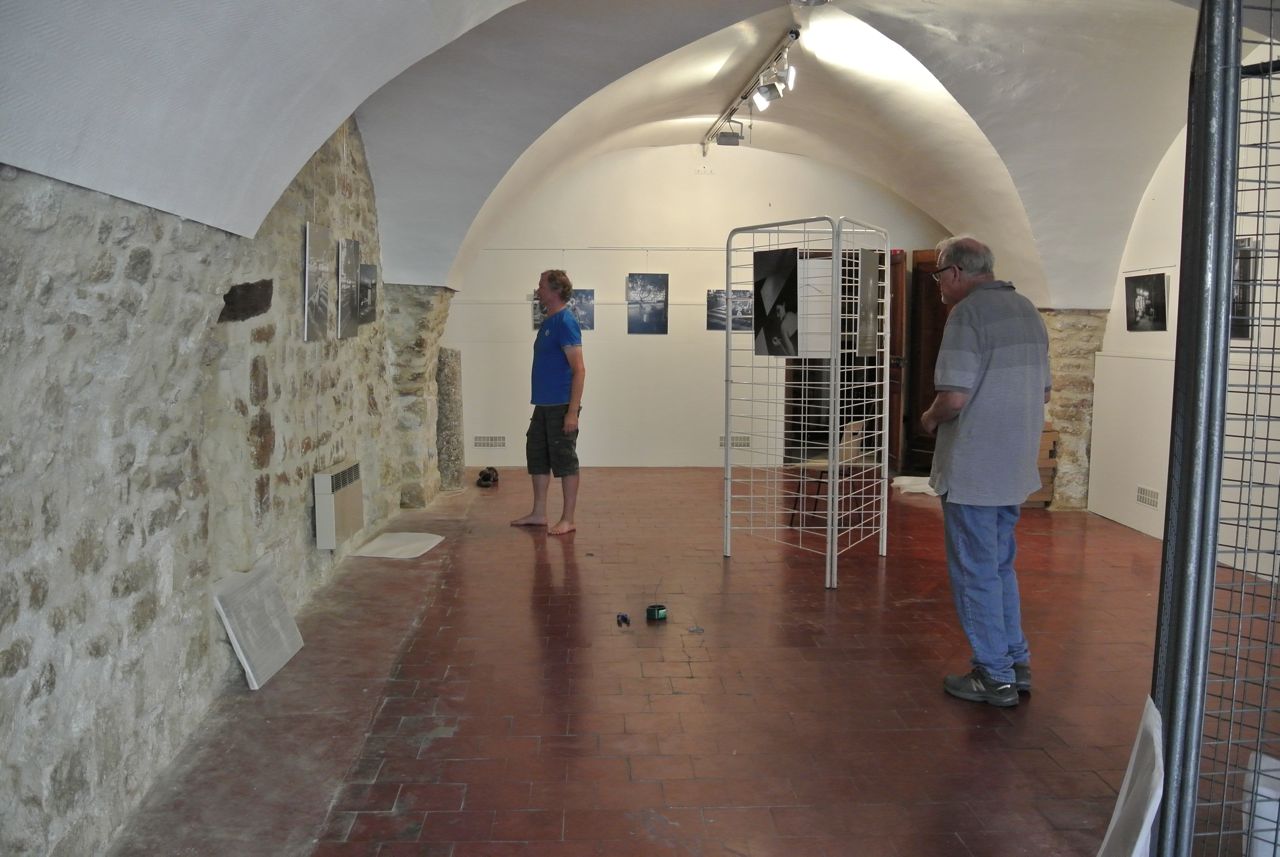 Discover half the spotlights in the expo hall aren’t working. Eek. Attempt to replace lightbulbs. Dash home to fetch stepladder in order to replace lightbulbs. Hang the photos – wait a minute, we don’t have enough hangers. Send the wife on a last minute dash to Manosque to source hangers (it wasn’t easy). Spend hours pondering the layout of the images with his buddy.