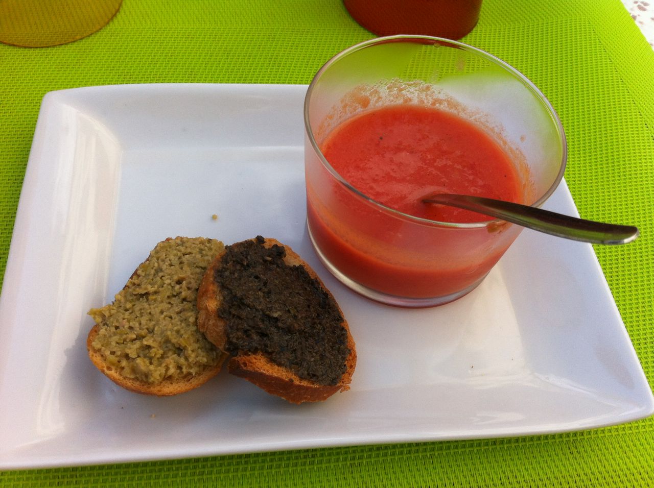 Velouté de tomate, tomato soup, served cold, with tapenade on the side. Very refreshing! We were off to a good start!