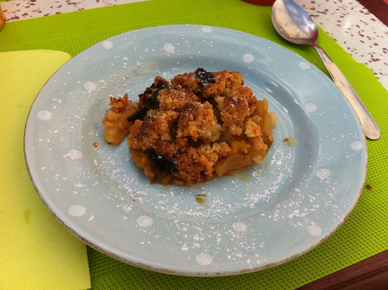 Dessert time…. the French have adopted some British things with gusto. Roundabouts and sleeping policemen (speed bumps) are two that we have noticed – they’re everywhere here. Crumble is a third British invention that the French love at the moment. We had two choices for dessert, chocolate mousse or pear and raisin crumble. I opted for the one that would NOT be guaranteed to trigger a migraine while I think everyone else went for the chocolate. Personally I think mine was nicer…