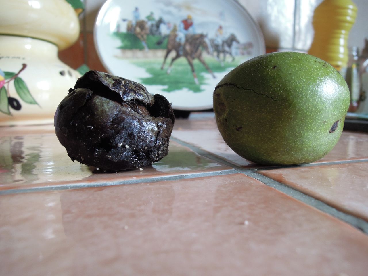 This is what they look like – a blackened one I picked off the ground on the left and a green one I picked off a tree on the right.