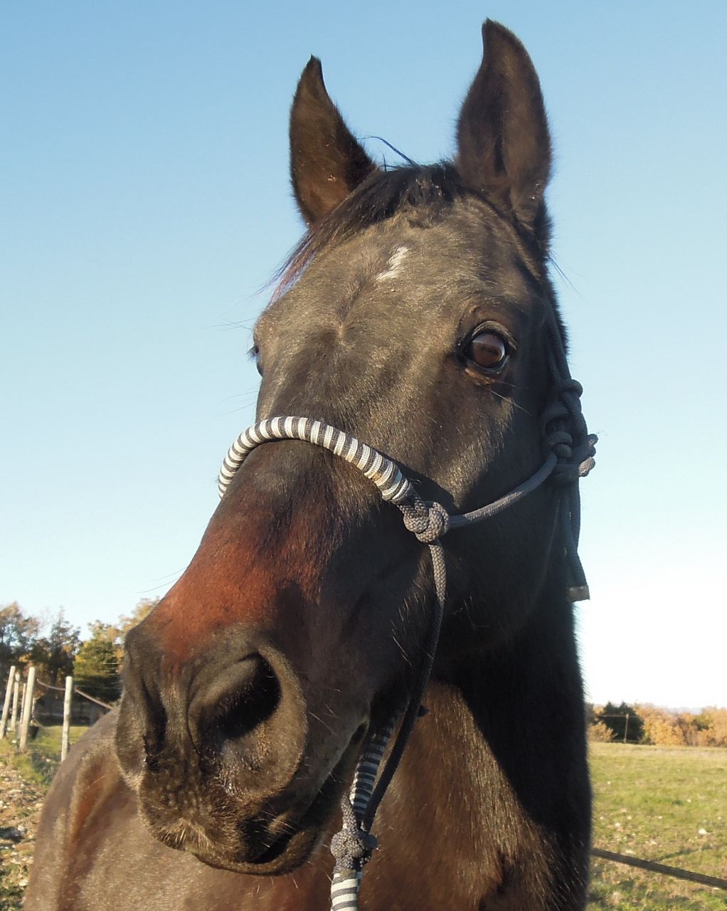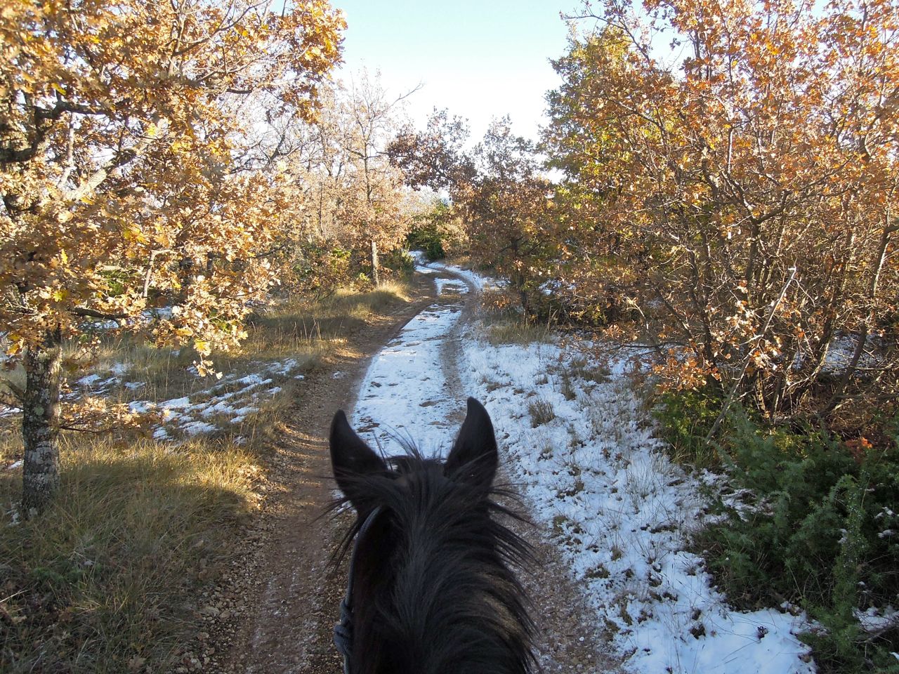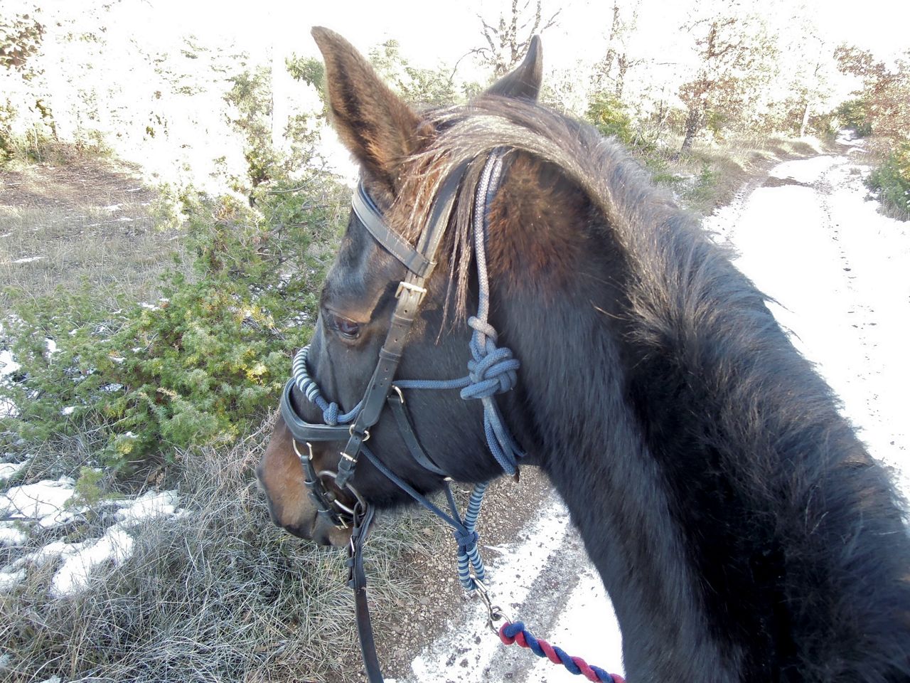 Today’s work in preparation for Sunday was focused on Aero. The horse I’m not taking. Well, I hadn’t done anything with him since Saturday and I wanted to play with him… so he had a good grooming session, then we did some travail sur sol in the round pen, after which I threw the trail saddle on him and we went for a 30 minute loop through the woods. When I stopped to pull out my camera, he was convinced there were carrots on the way.