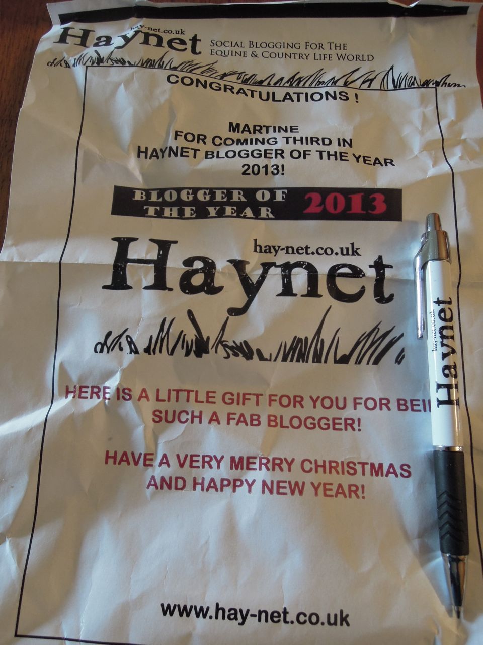 It’s my prize for coming third in the HayNet Blogger of the Year poll!! I got a HayNet pen! And a sort of certafekkit!! YAY!!