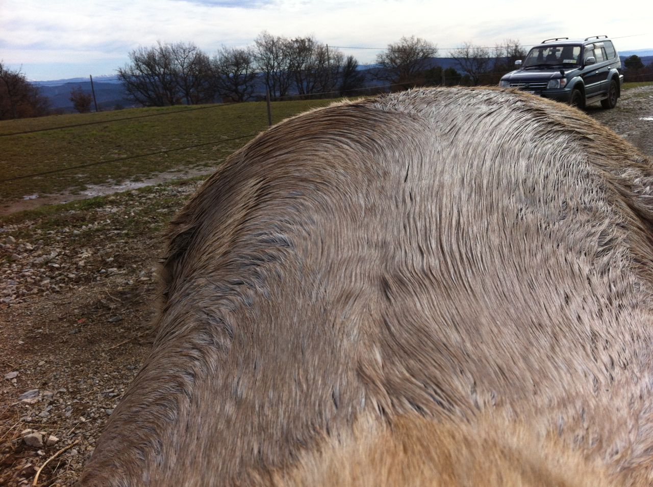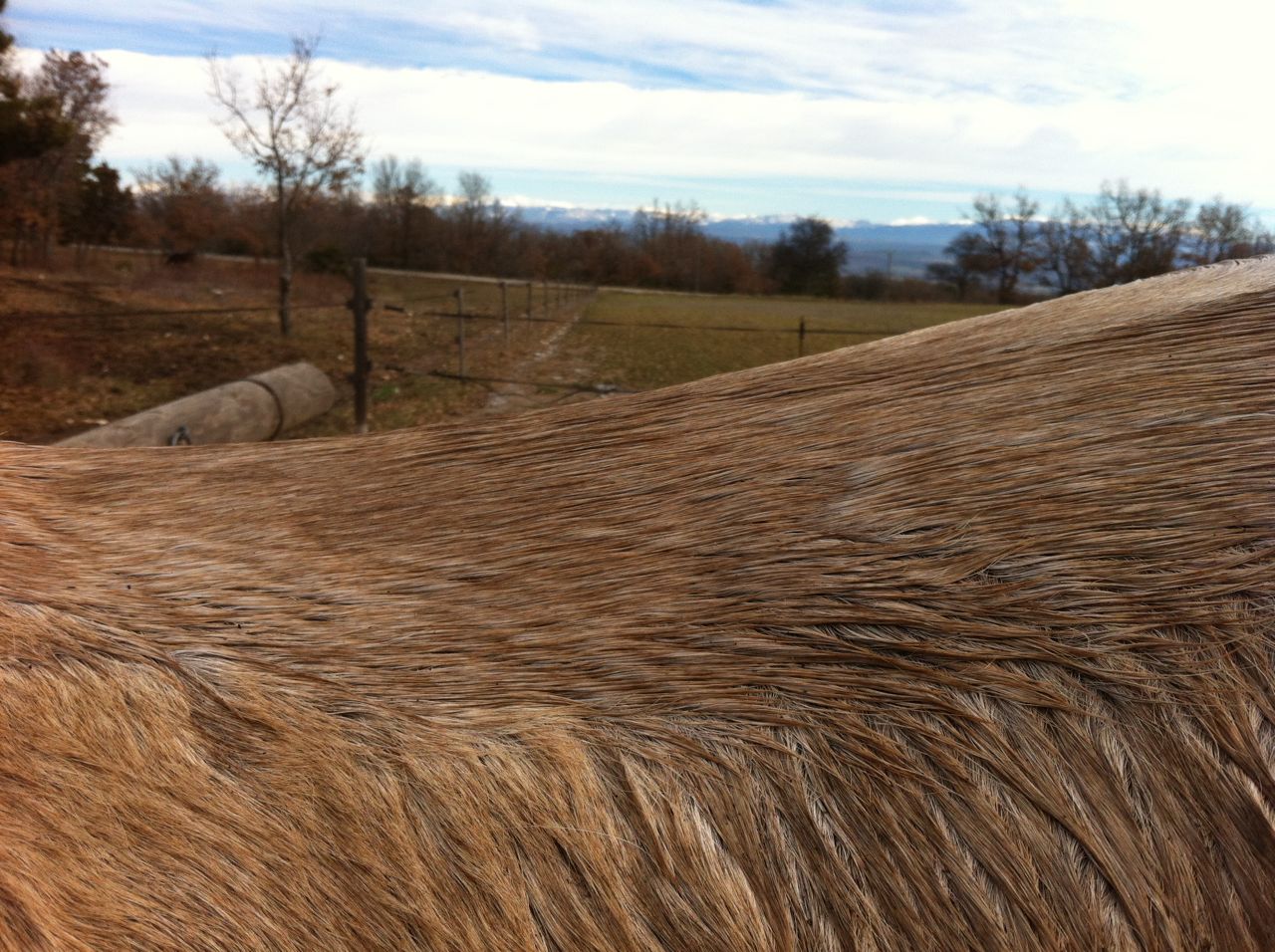 To be honest, I’m not sure if it’s rain rash or just lots of clumpy mud right down at skin level. Flurry’s such a mud-hound that it’s possible he’s ground the mud in skin deep. It didn’t seem sore when I picked and poked at it, but scrubbing with the metal curry comb didn’t shift it. In the end, I resorted to washing the suspect area – all along the spine over the loins – with water and tea tree oil.
