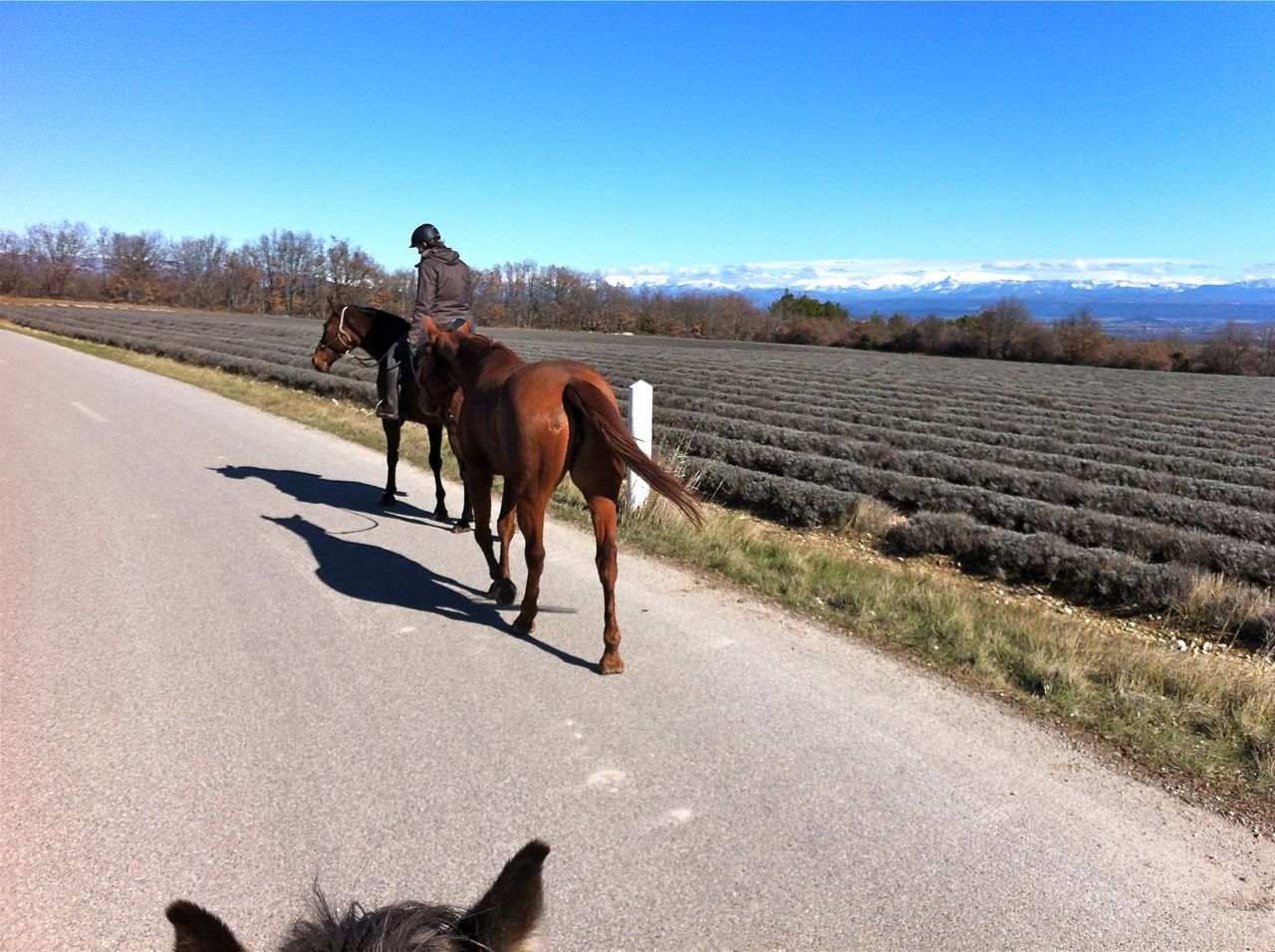 Back on to the road for 50 metres or so, lavender field beside us and the Alps in the distance.
